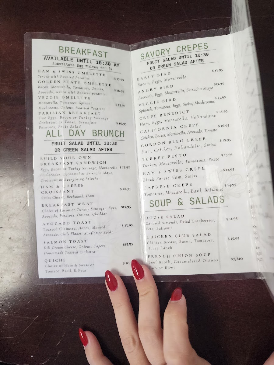 Breakfast or brunch enthusiasts will revel in their innovative savory crepes, such as the California Crepe, filled with chicken, bacon, avocado, tomatoes, and mozzarella cheese ($23.95). The Veggie Bird Crepe is another highlight, with its delightful combination of spinach, portobello mushrooms, tomatoes, and eggs, making it a perfect choice for brunch lovers. Clients rave about the Veg Omelette with mushrooms, mozzarella, and tomato, noting its satisfying flavors and freshness—truly a must-try!