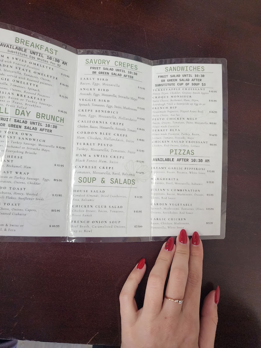 For that cafe where breakfast is celebrated all day long, just like Elizabeth Ready loves, Julian's Patisserie has created a community where brunch is for every day of the week. Amongst the delightful pastry case and aromatic coffee bar, patrons like Deborah Demander find themselves enchanted, savoring delicious food while enjoying the relaxed patio ambiance.